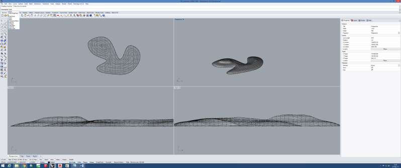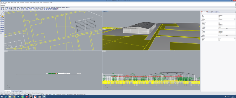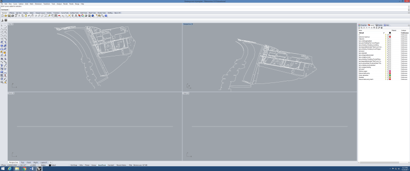De werkruimte in Rhinoceros bestaat uit een viertal verschillende views als startscherm, een toolbar aan de bovenzijde met diverse tabblade. Aan de linkerzijde bevinden zich enkele werktools die gebruikt worden voor het maken van een tekening, zie afbeelding 2.