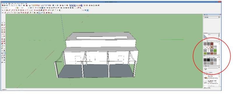 Het aanbrengen van structuren in sketchup gaat via materials in de rechtermenu balk, zie rode cirkel. Hier staan zowel structuren als kleuren in. De structuren zijn naar eigen wensen aan te passen.